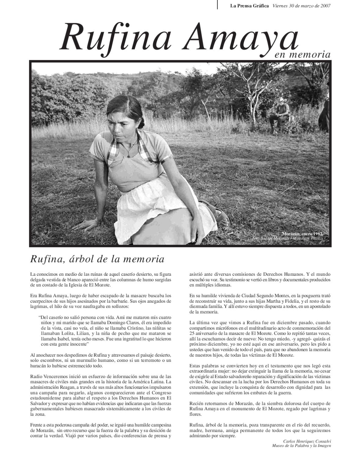 Rufina Amaya Published September 1, 2020 at 1182 × 1500 in Will the military files be opened? Latest developments on “El Mozote” trial Rufina Amaya, survivor of the massacre GET NOTIFICATIONS OF NEW POSTS ← Previous