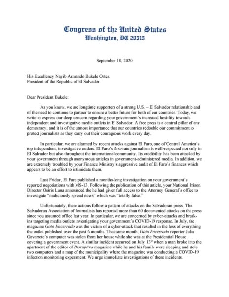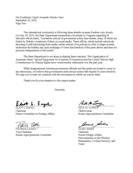 Miembros demócratas de la Cámara de Representantes y del Senado de los Estados Unidos, encabezados por el presidente del Comité de Asuntos Exteriores de la Cámara de Representantes, Eliot L. Engel, hicieron pública, este jueves 10 de septiembre, una carta en la que expresan “su profunda preocupación por la creciente hostilidad del gobierno salvadoreño hacia los medios de comunicación independientes y de investigación en el país” (X).