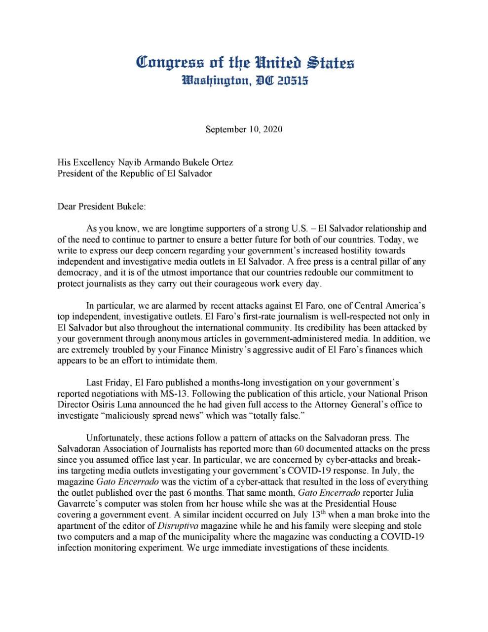Letter 1 Published September 10, 2020 at 989 × 1280 in U.S. Representatives send letter to Bukele about the attacks to the press / Representantes de los Estados Unidos envían carta a Bukele por los ataques a la prensa GET NOTIFICATIONS OF NEW POSTS Next →
